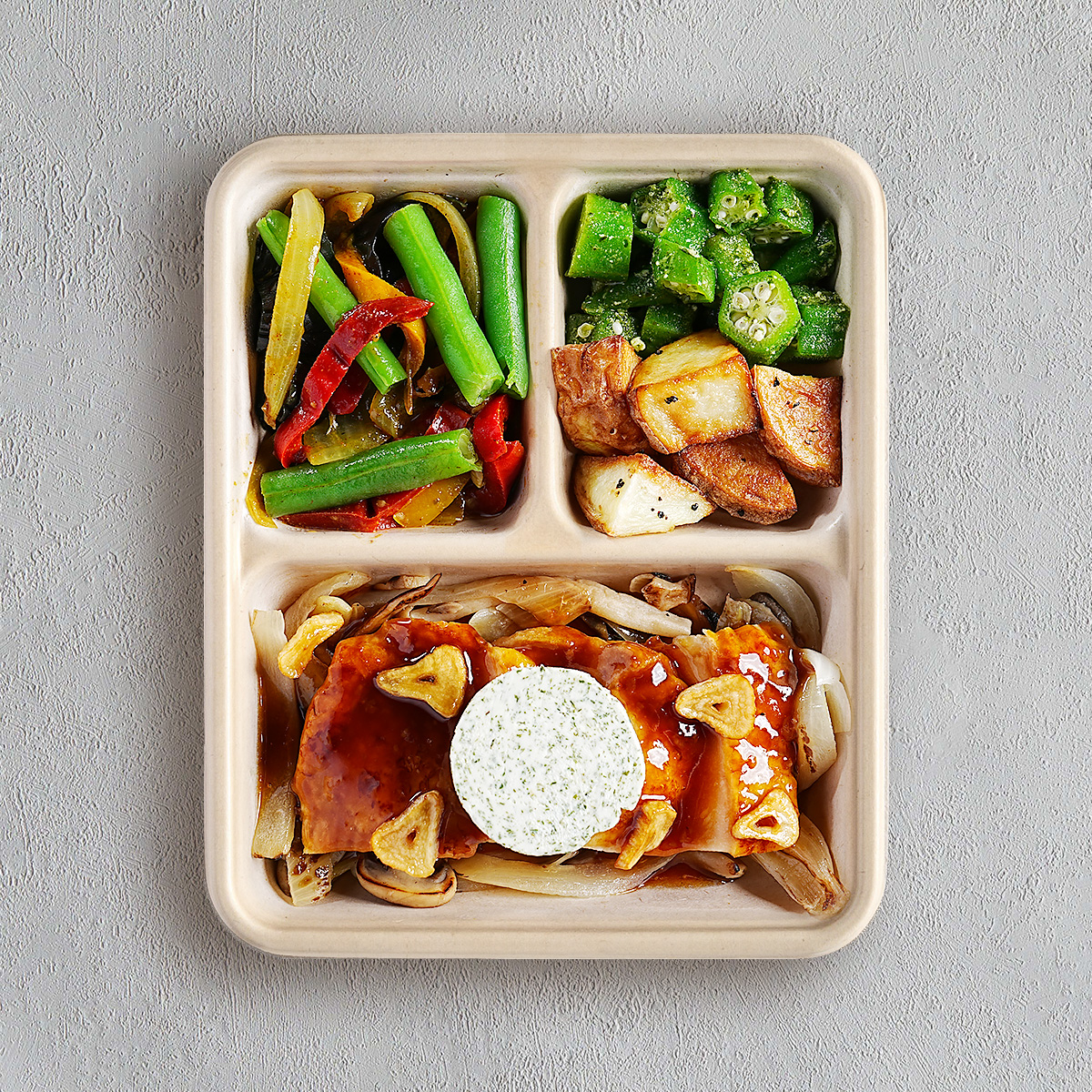 | メニュー | バターの旨味あふれる やみつきガリバタチキン | 12種スパイスのマイルドカレー-バターチキン&ポークジンジャー | 味わいほっこり 牛肉とごぼうの時雨煮 | ご飯がすすむ豚しゃぶビビンバ |