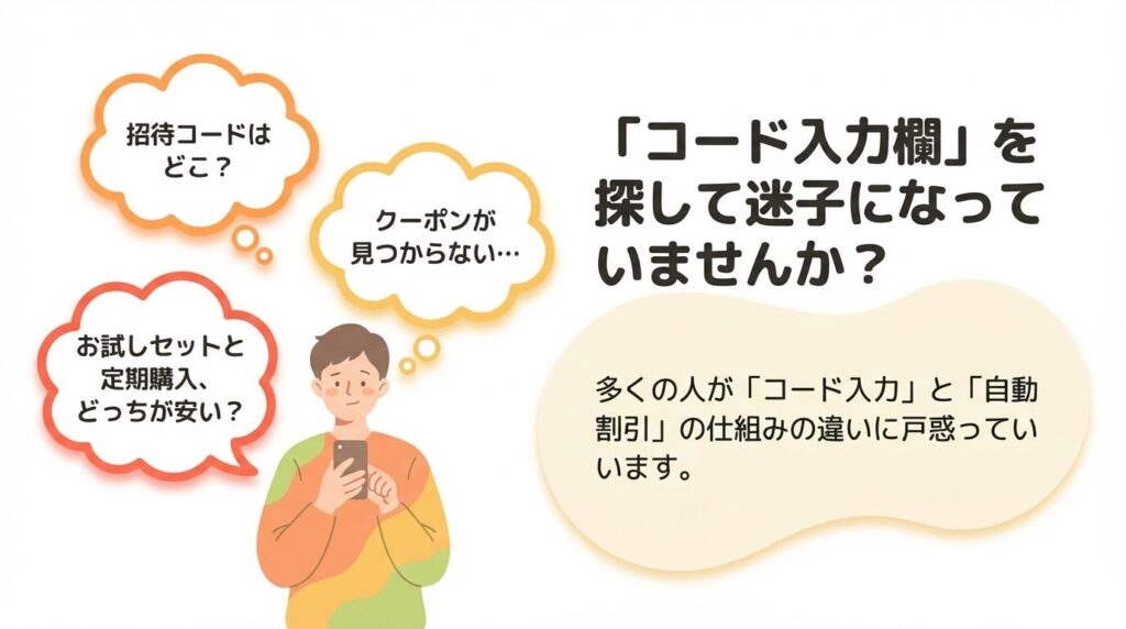いわゆる「クーポンコードを入力して使う」形式ではなく、初回定期購入を申し込むと自動的に割引が反映される仕組みです。