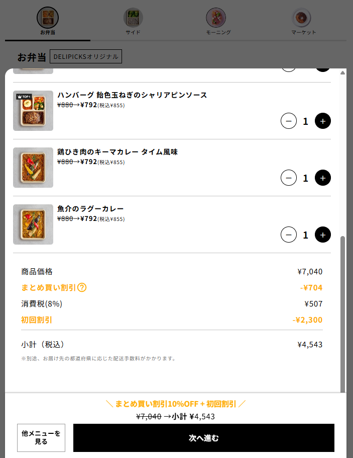 デリピックスの初回割引は、一般的な「クーポンコード入力」ではなく、注文手続きの途中で自動的に適用されます。
