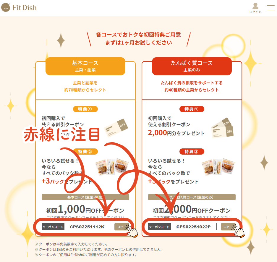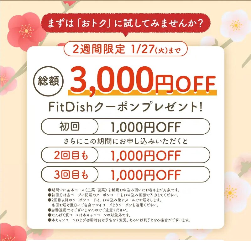 フィットディッシュでは、過去に割引クーポンとセット数が増える特典が同時に適用されたキャンペーンが実施されていました。