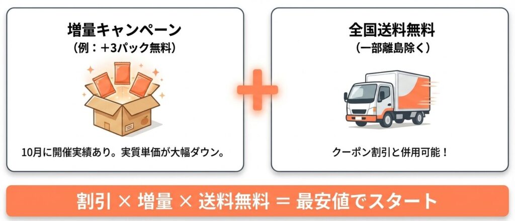 増量キャンペーンが行われている時期に初回クーポンを使えば、実質の割引率がさらに高くなることがあります。