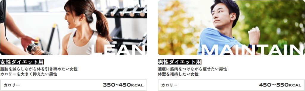 たとえば LEAN(女性向け) と MAINTAIN(男性向け) は、高たんぱく・低脂質を基本にしながら、必要な炭水化物を適量含む構成で、食後の満足感を保ちながらカロリーを抑えられるよう調整されています。